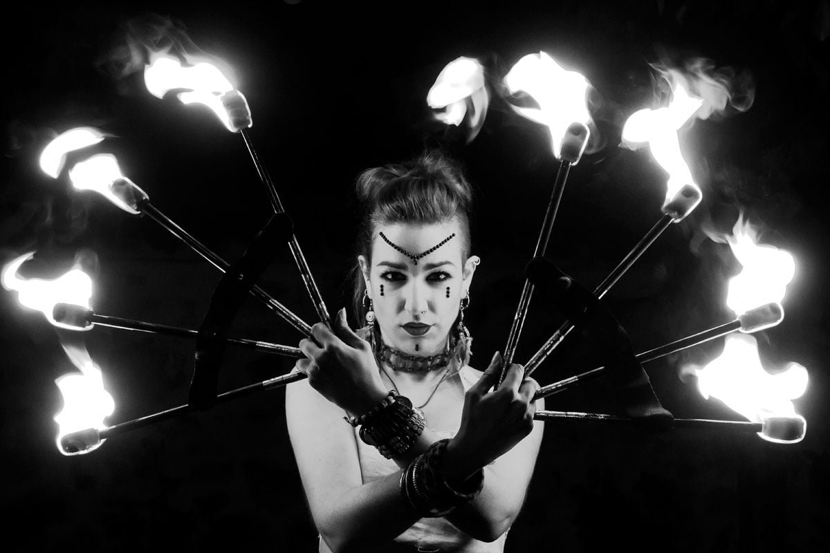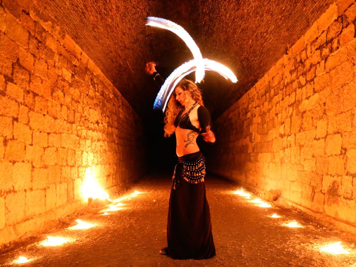 Sue te ofrece un espectáculo muy visual y dinámico que fusiona lo exótico de la danza tribal con el increíble mundo de los malabares de fuego. Utiliza diversos malabares como hulahop, cariocas, bastón y abanicos, y técnicas como escupir fuego. El show también cuenta con danza en sombras y malabares de luz que emiten dibujos reales y futuristas muy novedosos y espectaculares.
