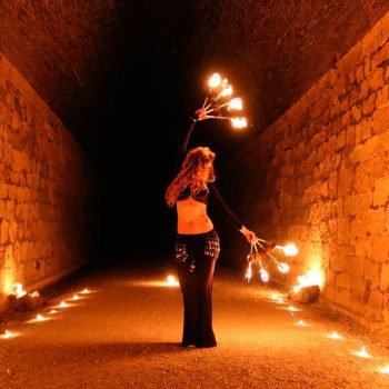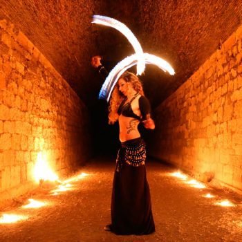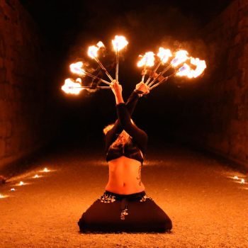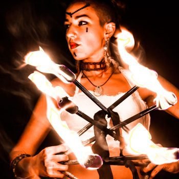 Sue te ofrece un espectáculo muy visual y dinámico que fusiona lo exótico de la danza tribal con el increíble mundo de los malabares de fuego. Utiliza diversos malabares como hulahop, cariocas, bastón y abanicos, y técnicas como escupir fuego. El show también cuenta con danza en sombras y malabares de luz que emiten dibujos reales y futuristas muy novedosos y espectaculares.